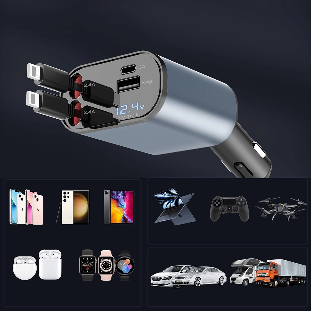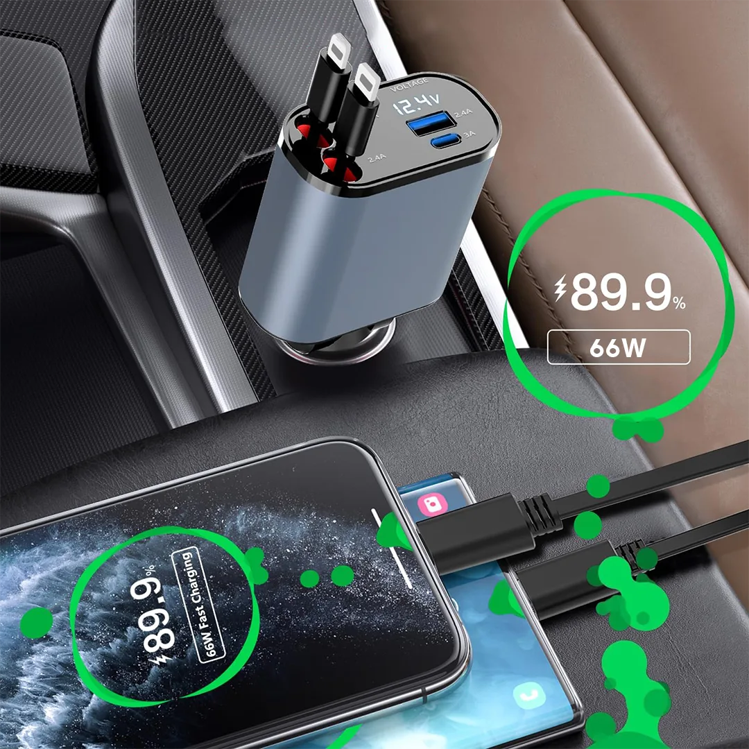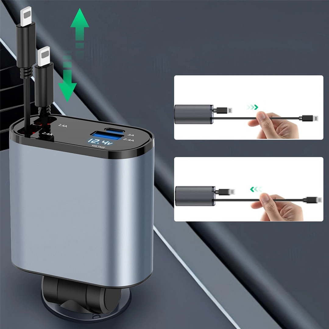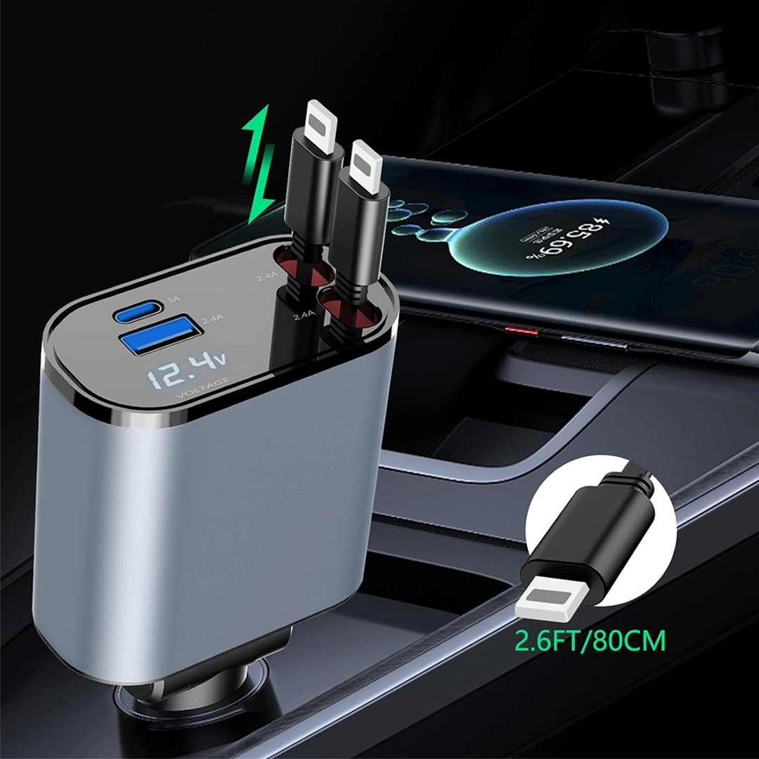 يحتوي الشاحن على كابلين Lightning مدمجين، بالإضافة إلى منفذ Type-C إضافي ومنفذ USB لتعزيز الراحة والتنوع.